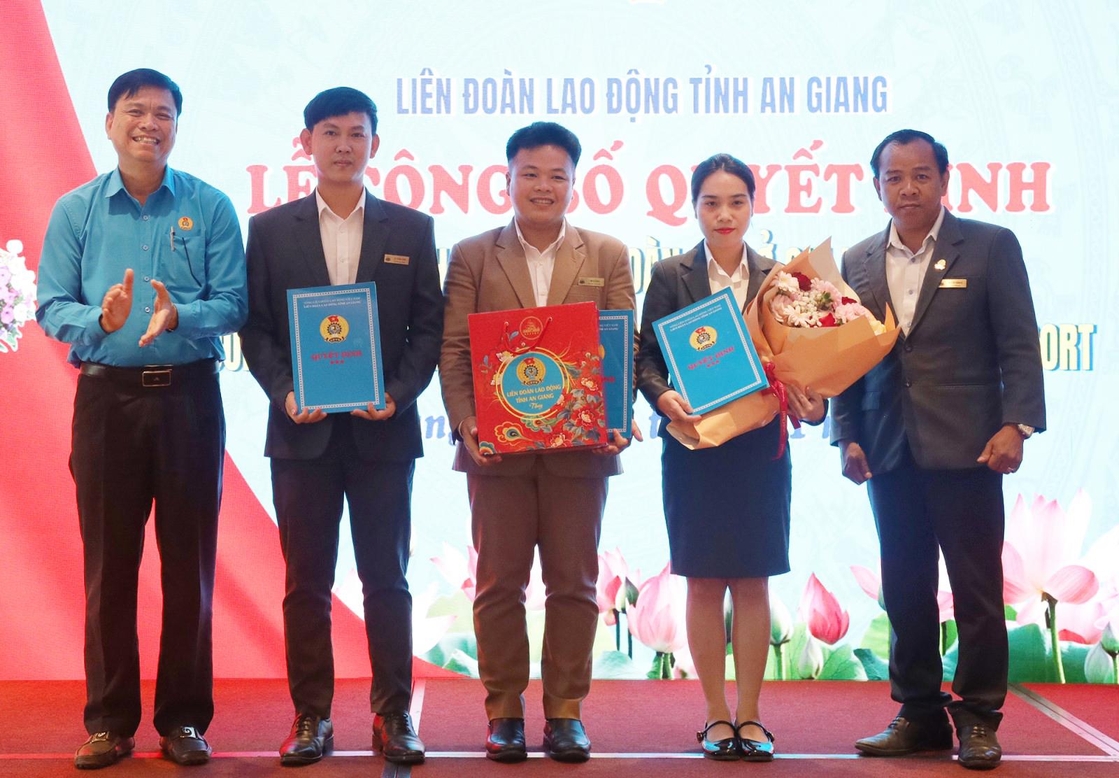 Chủ tịch Liên đoàn Lao động tỉnh An Giang Đỗ Trần Thịnh (bìa trái) và ông Nguyễn Thành Vị (bìa phải), Giám đốc Công ty Cổ phần KVY Việt Nam - MerPerle Núi Sam Resort trao quyết định thành lập Công đoàn cơ sở chi nhánh Công ty Cổ phần KVY Việt Nam - MerPerle Núi Sam Resort.