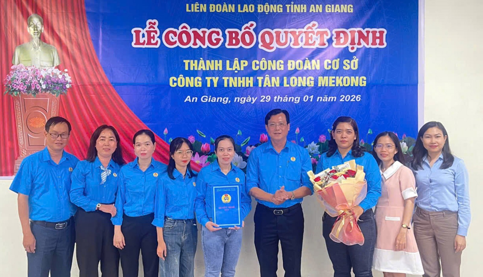 Ngày 29/1, Liên đoàn Lao động tỉnh An Giang tổ chức lễ công bố quyết định thành lập Công đoàn cơ sở Công ty TNHH Tân Long Mekong, tọa lạc xã Chợ Vàm, tỉnh An Giang.