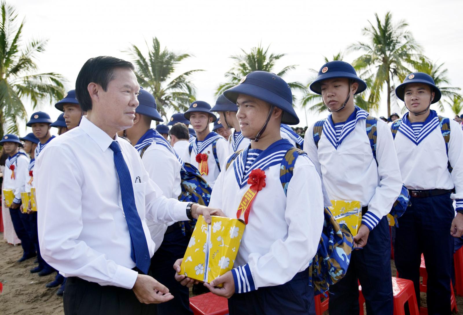 Phó Chủ tịch UBND tỉnh An Giang Lê Văn Phước tặng quà động viên các tân binh.