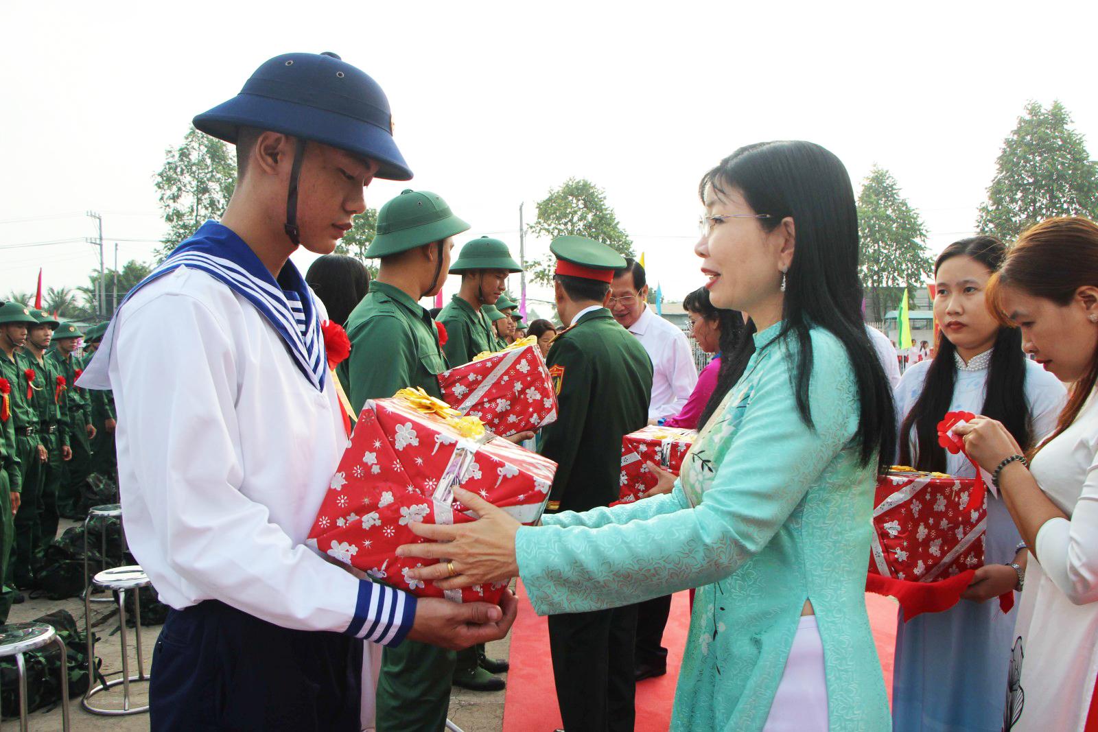 Đồng chí Trần Thị Thanh Hương, Phó Bí thư Tỉnh ủy, Trưởng đoàn Đại biểu Quốc hội tỉnh, Chủ tịch Ủy ban MTTQ Việt Nam tỉnh An Giang tặng quà động viên các tân binh.