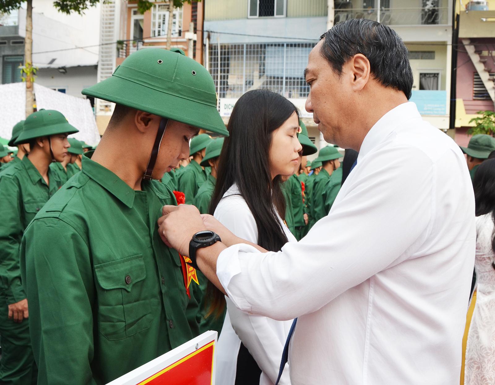 Bí thư Đảng ủy phường Hà Tiên cài hoa động viên tân binh trước khi lên đường nhập ngũ.