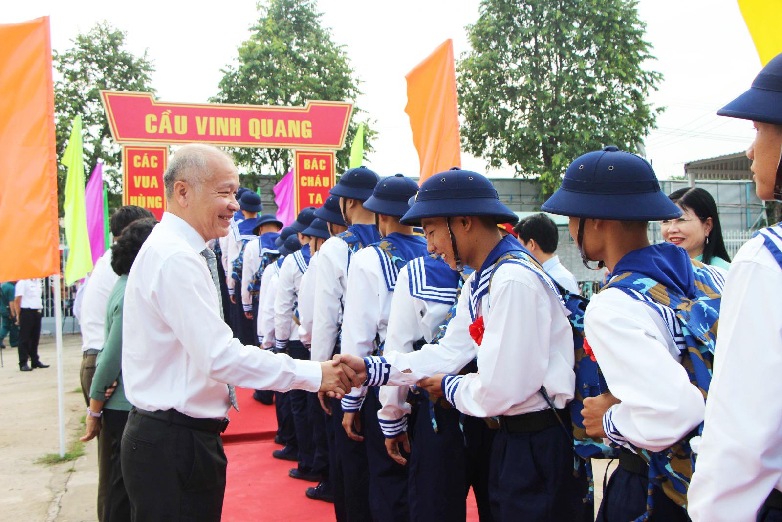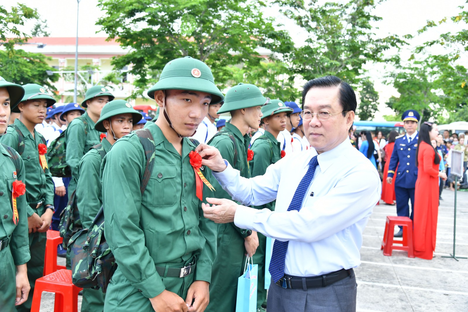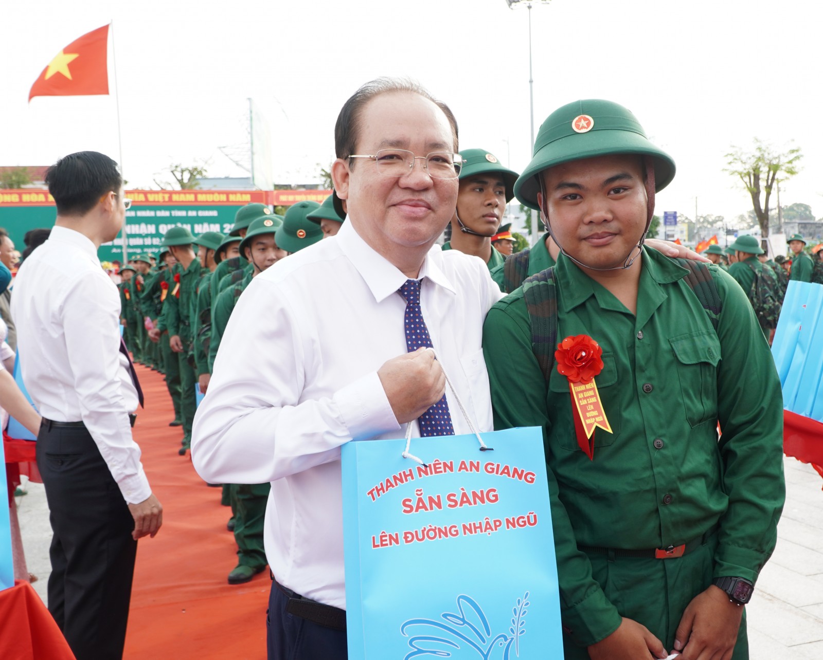 Phó Bí thư Thường trực Tỉnh ủy, Chủ tịch HĐND tỉnh An Giang Nguyễn Thanh Nhàn động viên thanh niên lên đường nhập ngũ.