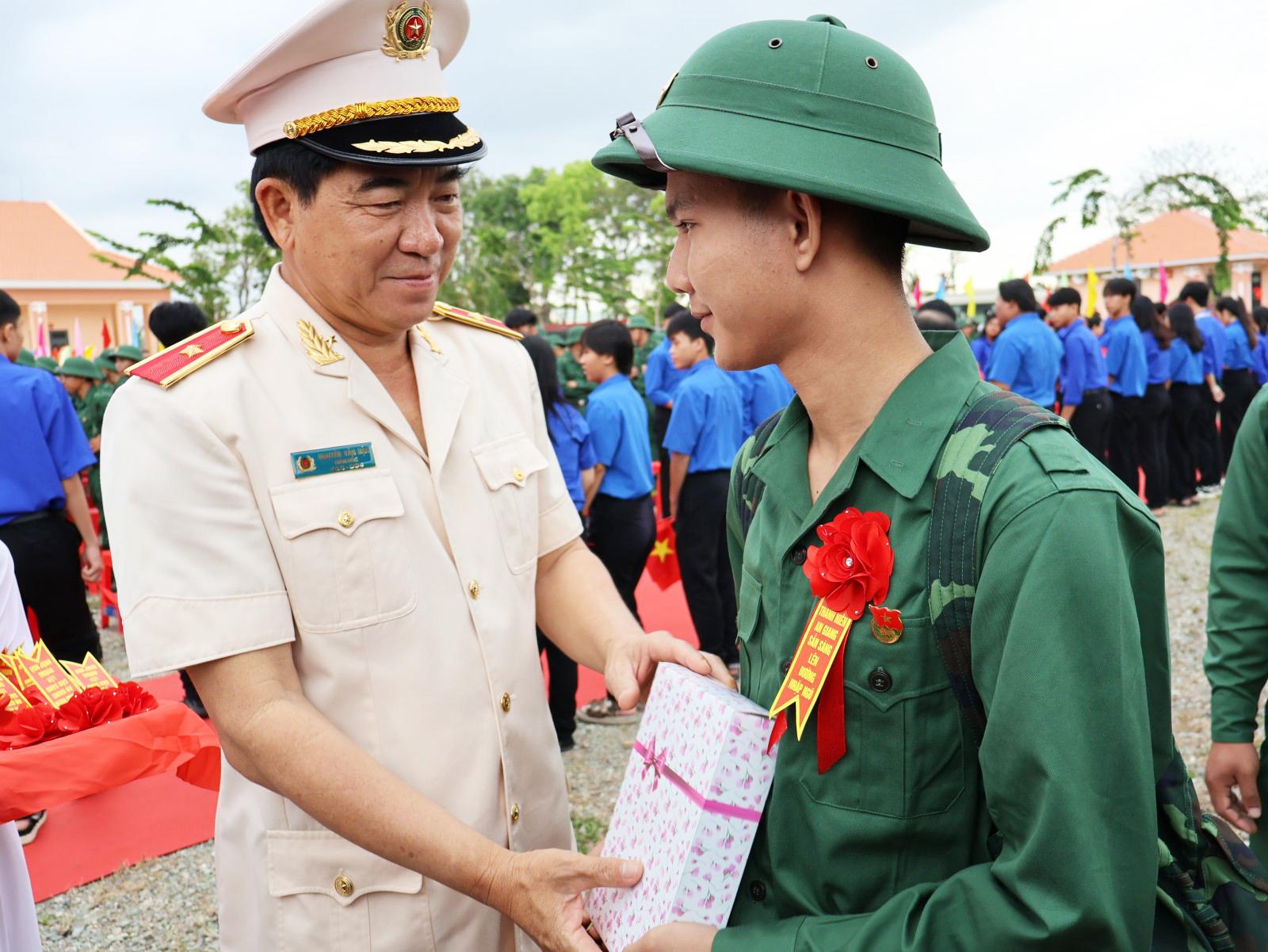 Thiếu tướng Nguyễn Văn Hận, Ủy viên Ban Thường vụ Tỉnh ủy, Giám đốc Công an tỉnh tặng quà cho tân binh.