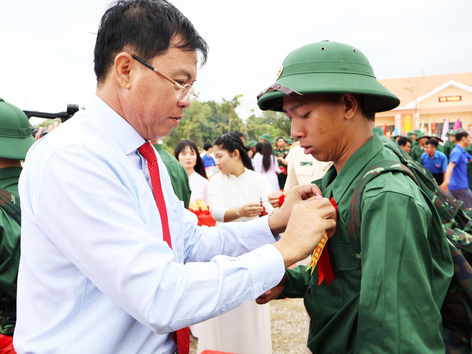 Đồng chí Phạm Hoàng Nam, Ủy viên Ban Thường vụ Tỉnh ủy, Trưởng ban Tổ chức Tỉnh ủy cài hoa, trao quà cho tân binh.