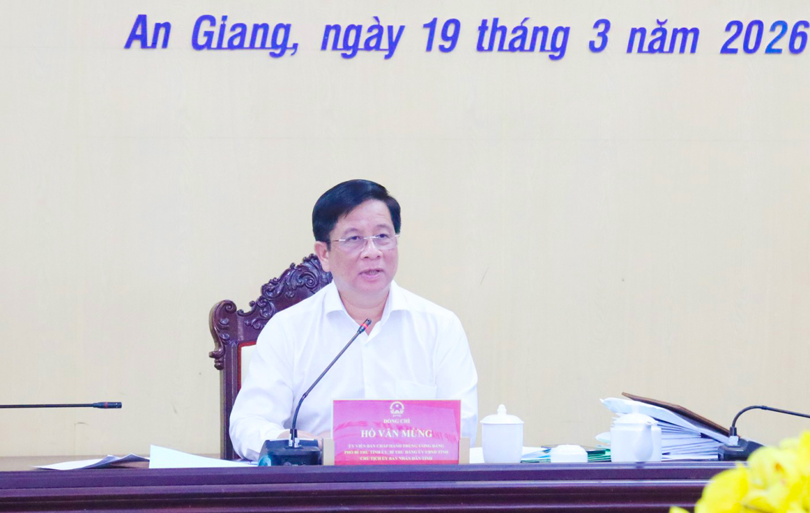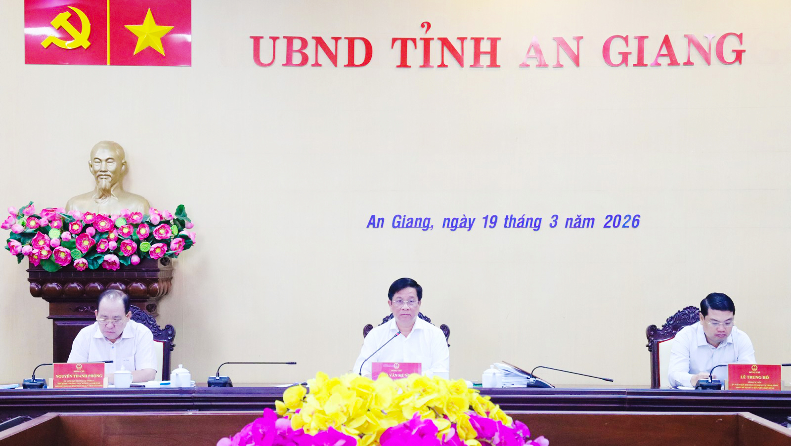 - Chiều 19/3, UBND tỉnh An Giang tổ chức họp để thông qua thành viên UBND tỉnh về các nội dung thuộc thẩm quyền quyết và trình Ban Thường vụ Đảng ủy UBND tỉnh. Cuộc họp do Ủy viên Ban Chấp hành Trung ương Đảng, Phó Bí thư Tỉnh ủy, Chủ tịch UBND tỉnh An Giang Hồ Văn Mừng chủ trì.