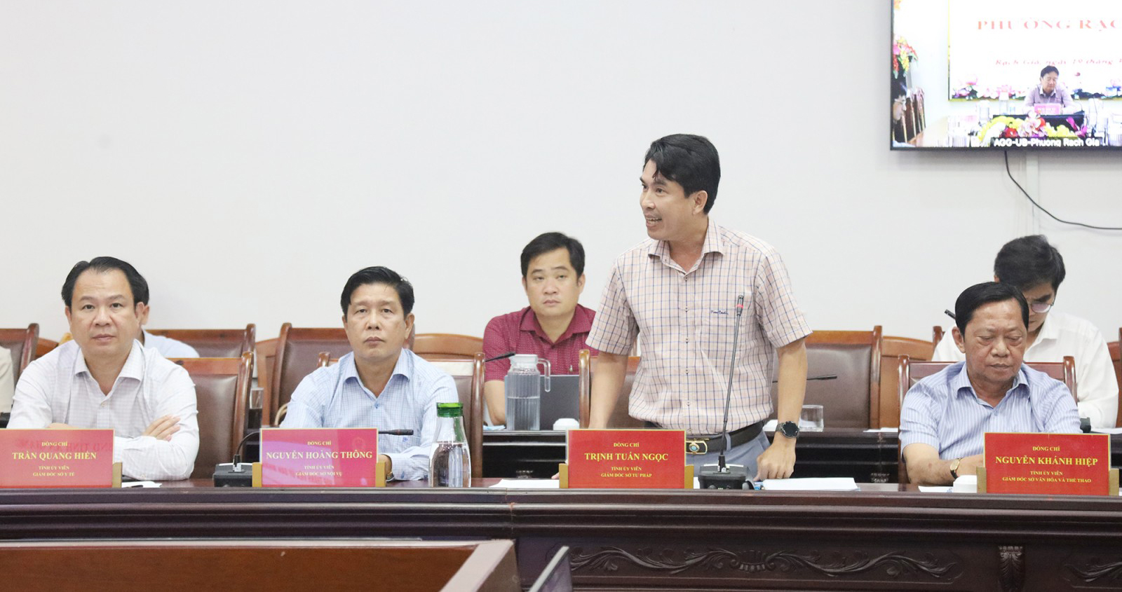 Ủy viên Ban Chấp hành Trung ương Đảng, Phó Bí thư Tỉnh ủy, Chủ tịch UBND tỉnh An Giang Hồ Văn Mừng (giữa) chủ trì cuộc họp để thông qua thành viên UBND tỉnh về các nội dung thuộc thẩm quyền quyết và trình Ban Thường vụ Đảng ủy UBND tỉnh.