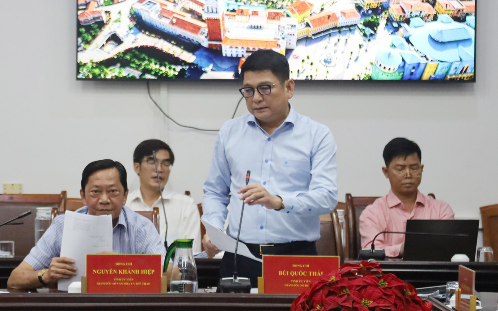 Giám đốc Sở Du lịch tỉnh An Giang Bùi Quốc Thái báo cáo việc lựa chọn Logo du lịch và Slogan du lịch tỉnh An Giang.