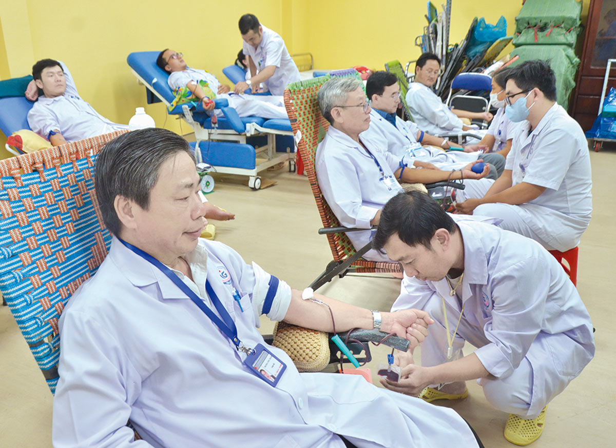 Cán bộ, viên chức, người lao động Bệnh viện Đa khoa Kiên Giang tham gia hiến máu tình nguyện. Ảnh: MI NI