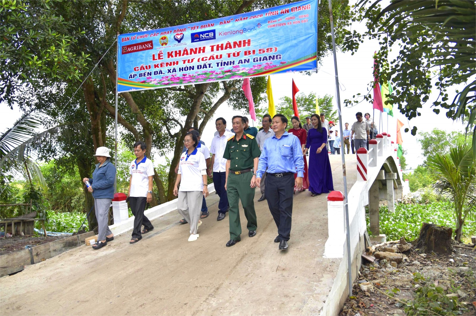 Phó Chủ tịch Ủy ban MTTQ Việt Nam tỉnh, Chủ tịch Hội Nông dân tỉnh An Giang Nguyễn Văn Cọp (hàng đầu, bìa phải) cùng các nhà hảo tâm thực hiện nghi thức thông cầu giao thông nông thôn tại ấp Bên Đá, xã Hòn Đất, 1 trong 13 cầu do hội vận động tài trợ.