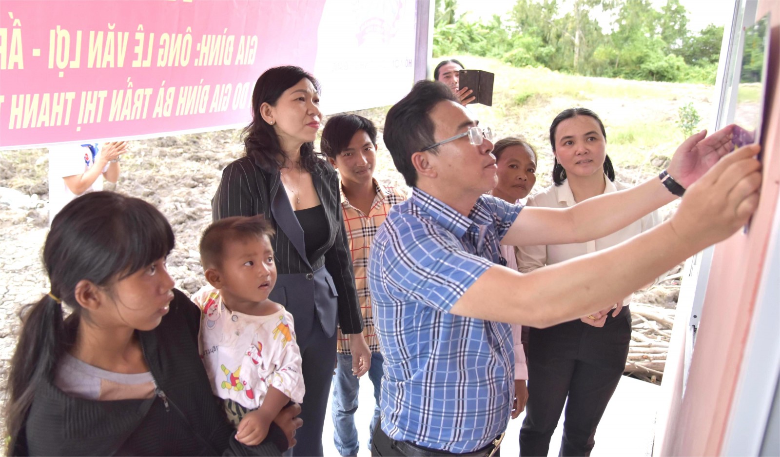 Phó Chủ tịch Thường trực Hội Nông dân tỉnh An Giang Lâm Quốc Toàn gắn bảng bàn giao “Mái ấm nông dân” cho hộ nghèo xã Hòa Điền.