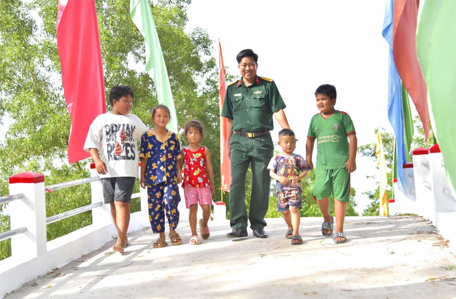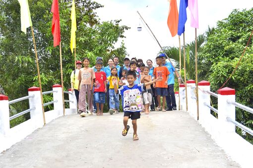 Trẻ em ấp Tân Điền, xã Hòa Điền vui mừng đi trên cầu giao thông nông thôn được Hội Nông dân tỉnh An Giang tài trợ xây dựng.