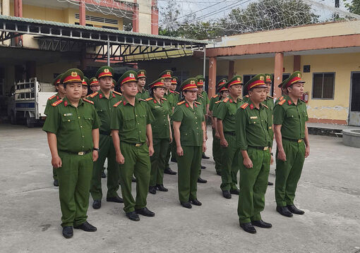 Cán bộ, chiến sĩ Công an xã Giồng Riềng trong lễ chào cờ. Ảnh: MỘC TRÀ