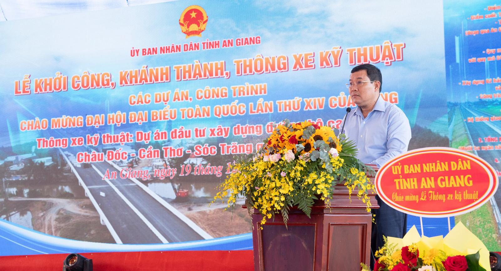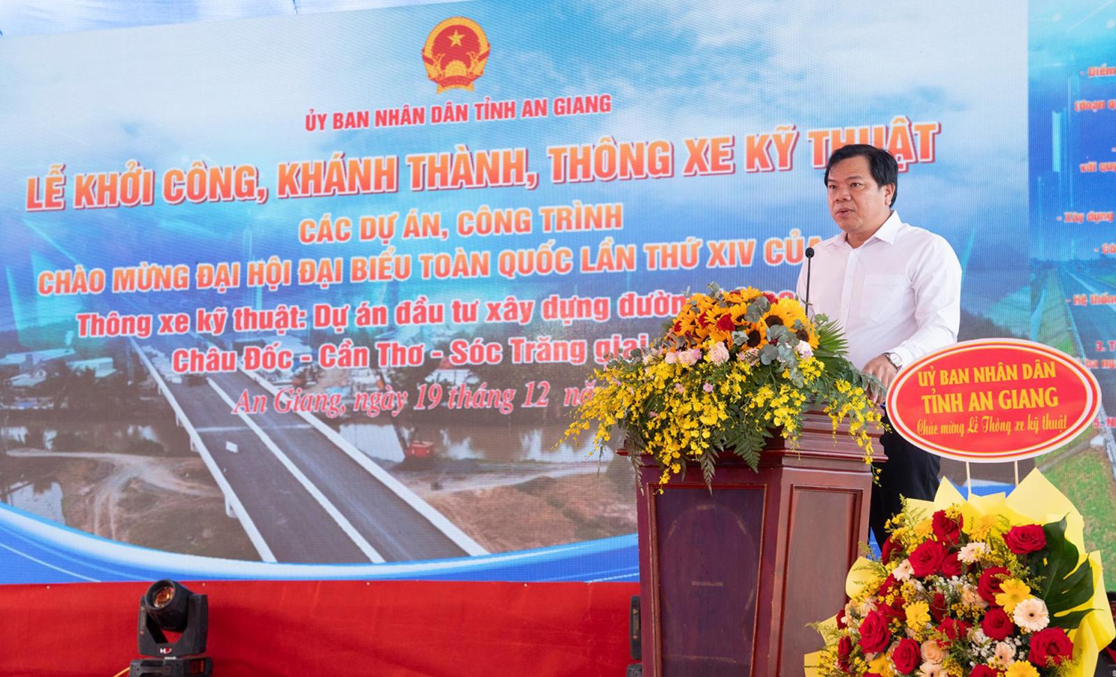 Phát biểu tại buổi lễ, Phó Chủ tịch UBND tỉnh An Giang Ngô Công Thức biểu dương chủ đầu tư và các nhà thầu, nhất là đội ngũ cán bộ, kỹ sư, công nhân, người lao động đã nỗ lực thi công với tinh thần “vượt nắng, thắng mưa; ăn tranh thủ ngủ khẩn trương; thi công 3 ca, 4 kíp; làm việc xuyên lễ, xuyên tết, xuyên ngày nghỉ” theo đúng tinh thần chỉ đạo của Thủ tướng Chính phủ và chỉ đạo của UBND tỉnh.
