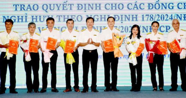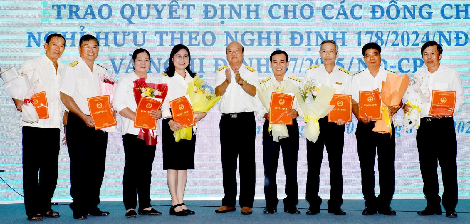 Trưởng Thuế tỉnh An Giang Nguyễn Thanh Bình (giữa) trao quyết định nghỉ hưu trước tuổi, nghỉ thôi việc theo Nghị định 178/2024/NĐ-CP và Nghị định 67/2025/NĐ-CP đợt 1/8/2025.