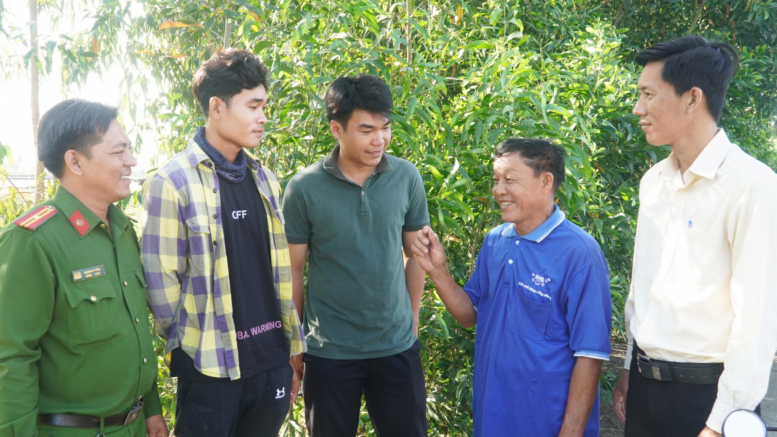 Ông Lý Văn Khô (thứ hai, từ phải qua) cùng lực lượng công an tuyên truyền, vận động người dân địa phương chấp hành tốt chủ trương của Đảng, chính sách, pháp luật của Nhà nước. Ảnh: DANH THÀNH