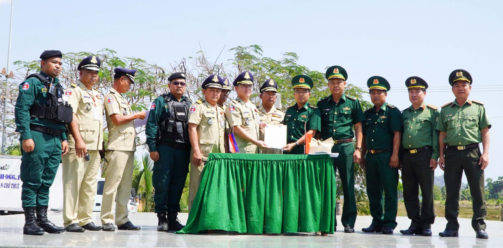 Chỉ huy Đồn Biên phòng Cửa khẩu quốc tế Hà Tiên và chỉ huy Đồn Công an Cửa khẩu Prek Chak ký biên bản bàn giao và tiếp nhận công dân Việt Nam.