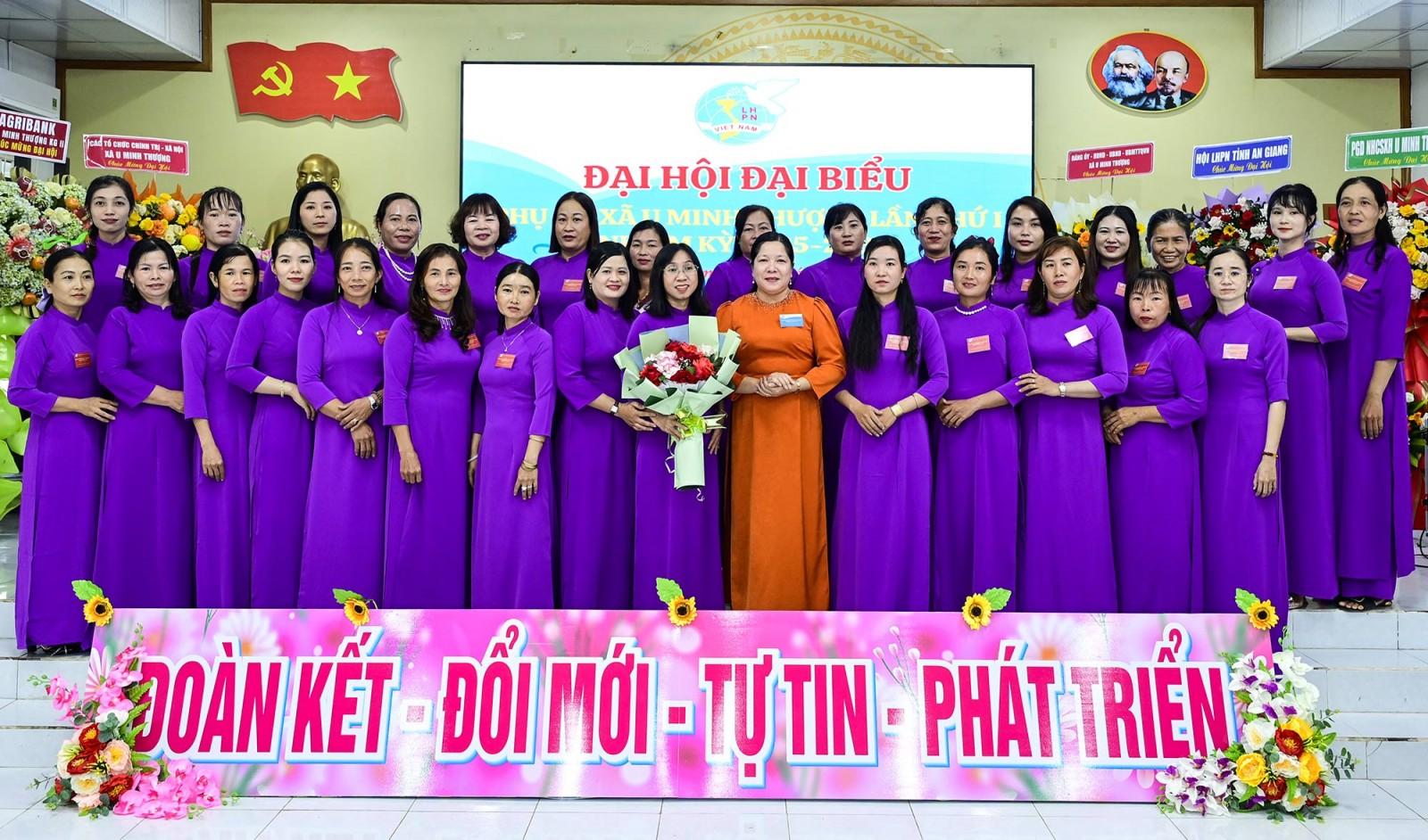 Phó Chủ tịch Hội Liên hiệp Phụ nữ tỉnh An Giang Lê Thị Ngọc Dung tặng hoa chúc mừng Ban Chấp hành Hội Liên hiệp Phụ nữ xã U Minh Thượng nhiệm kỳ 2025 - 2030.