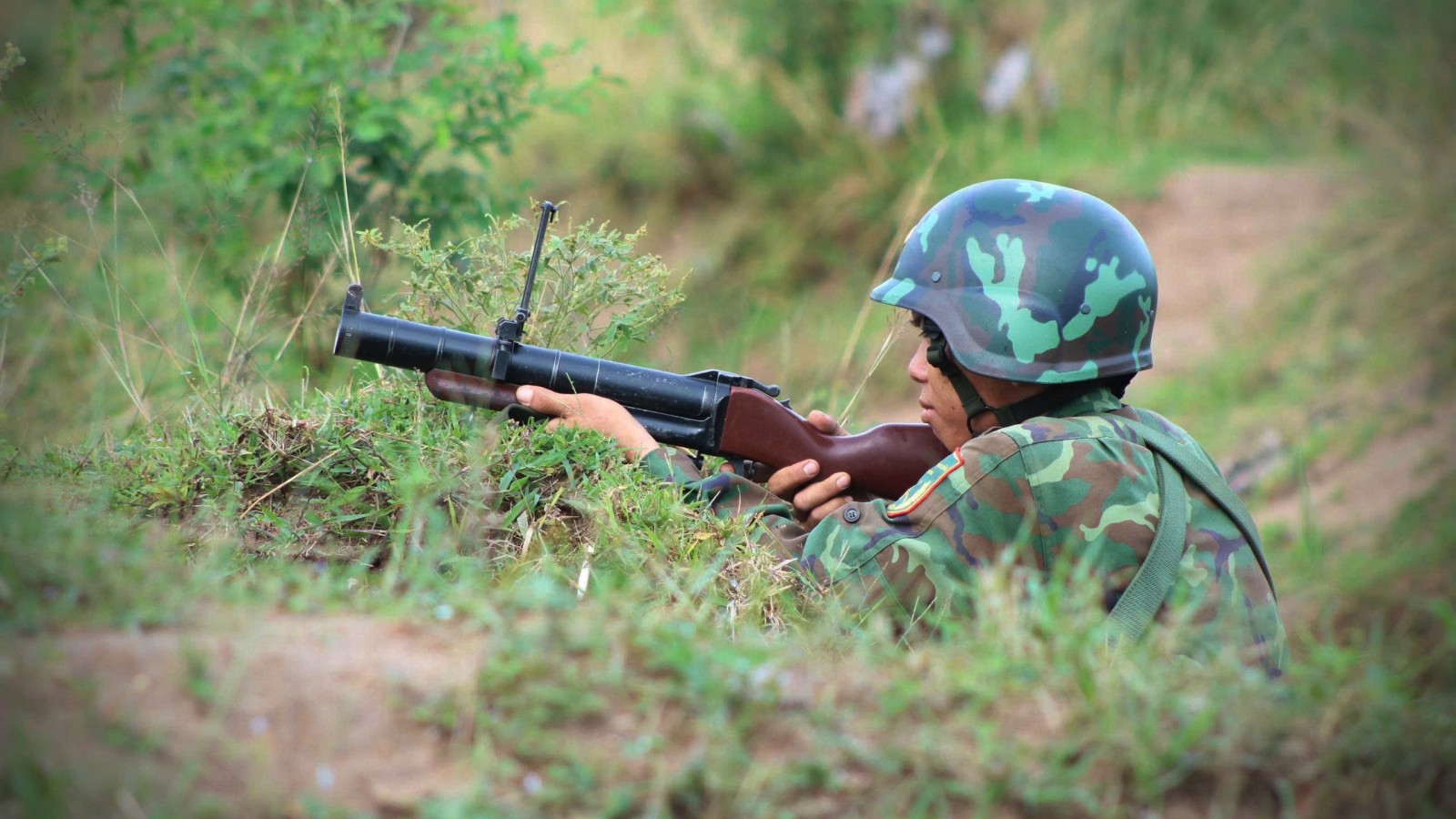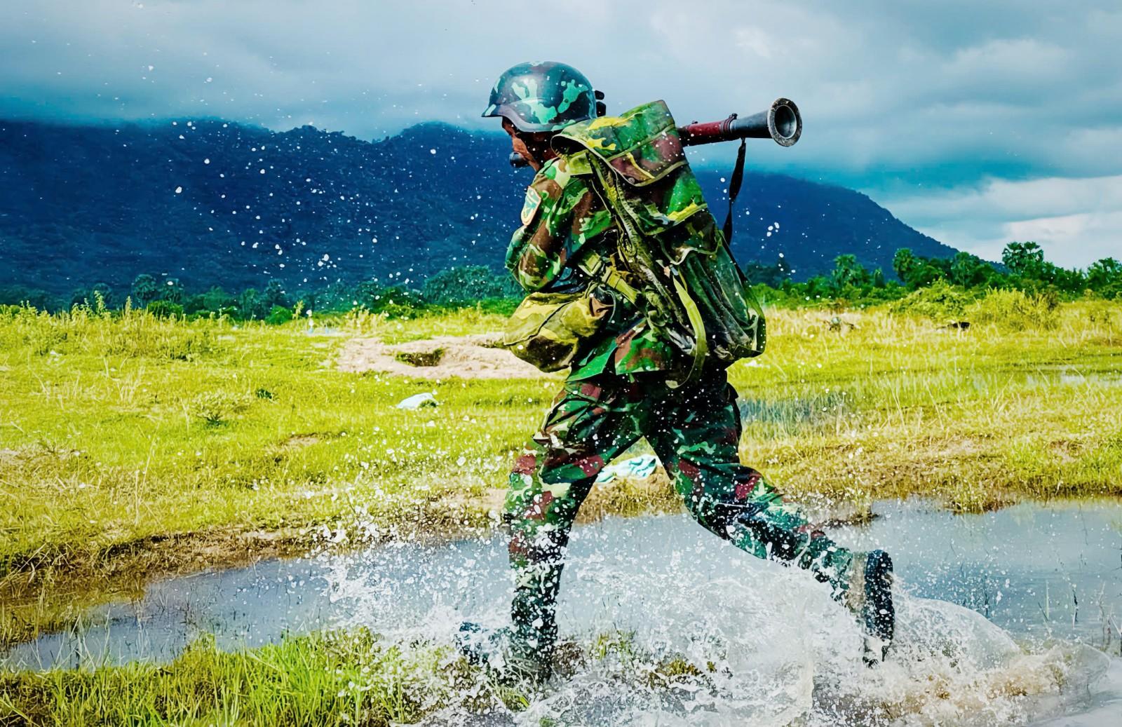 Chiến sĩ súng phóng lựu M79 diễn tập tham gia hỏa lực chuẩn bị mở cửa đánh chiếm.