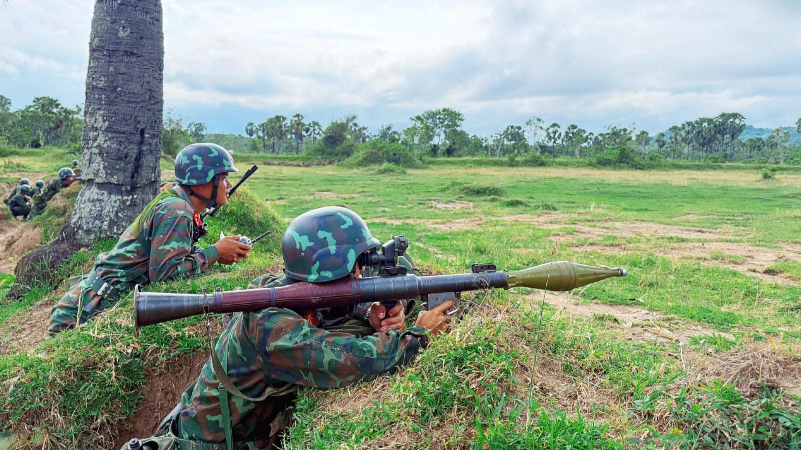 Chiến sĩ B41 diễn tập tham gia hỏa lực chuẩn bị mở cửa đánh chiếm.