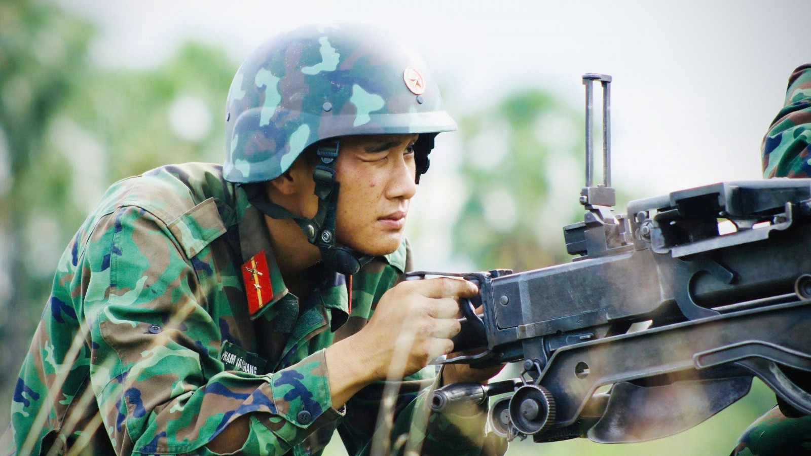 Chiến sĩ súng máy phòng không 12.7 diễn tập tăng cường quan sát, bắn máy bay bay thấp, trực thăng vũ trang bảo vệ đội hình.