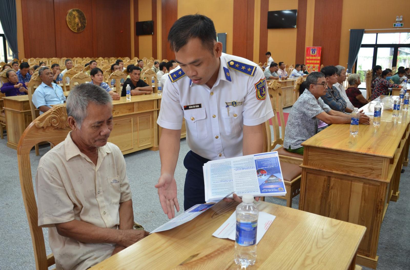 Lực lượng Cảnh sát biển 4 phát tờ rơi tuyên truyền phòng, chống khai thác IUU đến ngư dân.