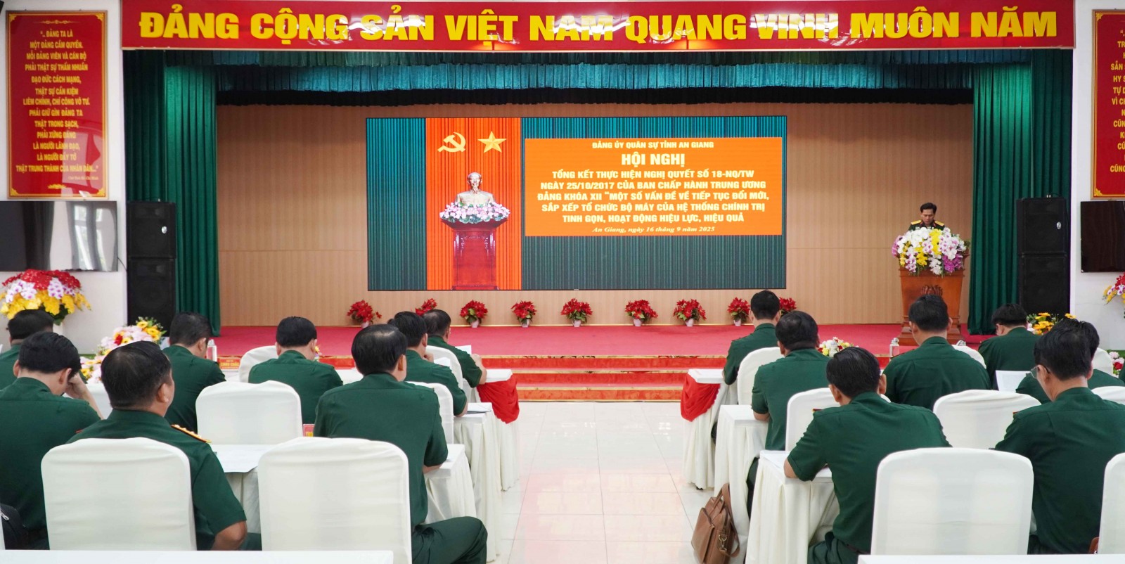 Chiều 16/9, Đảng ủy Quân sự tỉnh An Giang tổ chức Hội nghị tổng kết thực hiện Nghị quyết số 18-NQ/TW, ngày 25/10/2017 của Ban Chấp hành Trung ương Đảng khóa XII “Một số vấn đề về tiếp tục đổi mới, sắp xếp tổ chức bộ máy của hệ thống chính trị tinh gọn, hoạt động hiệu lực, hiệu quả”.