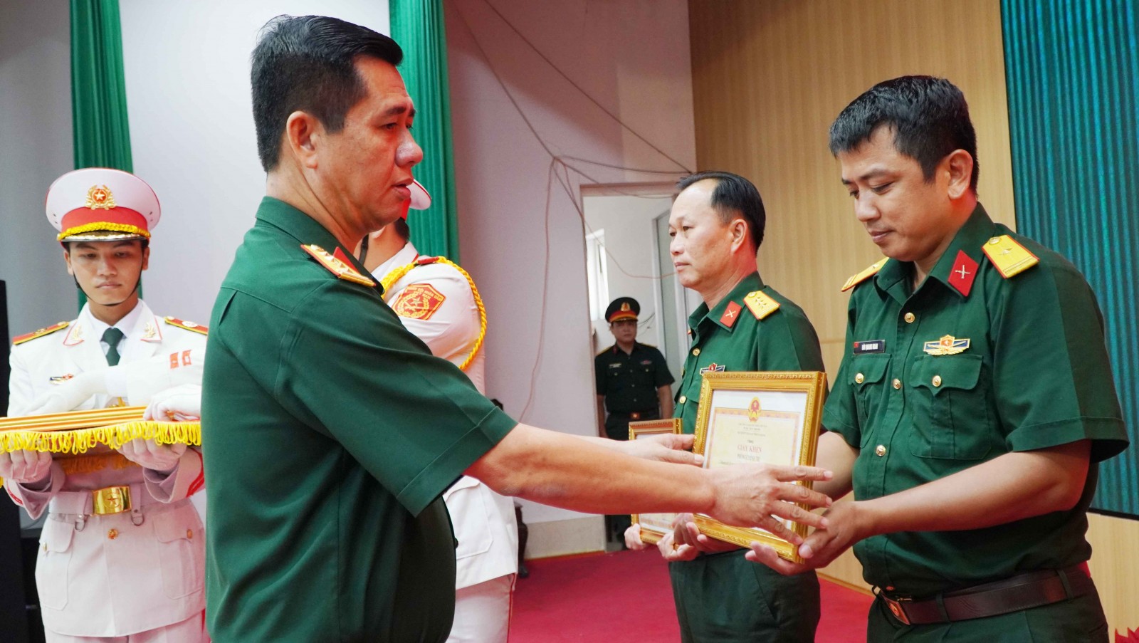 Đại tá Huỳnh Văn Khởi, Phó Bí thư Thường trực Đảng ủy, Chính ủy Bộ Chỉ huy Quân sự tỉnh An Giang trao giấy khen cho các tập thể.