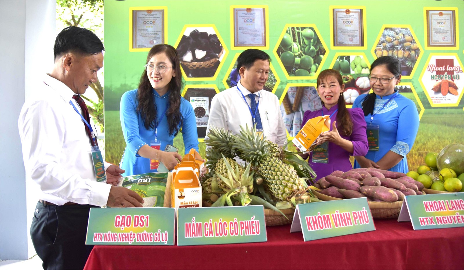 Đại biểu tham quan gian hàng trưng bài sản phẩm OCOP của nông dân xã Long Thạnh.