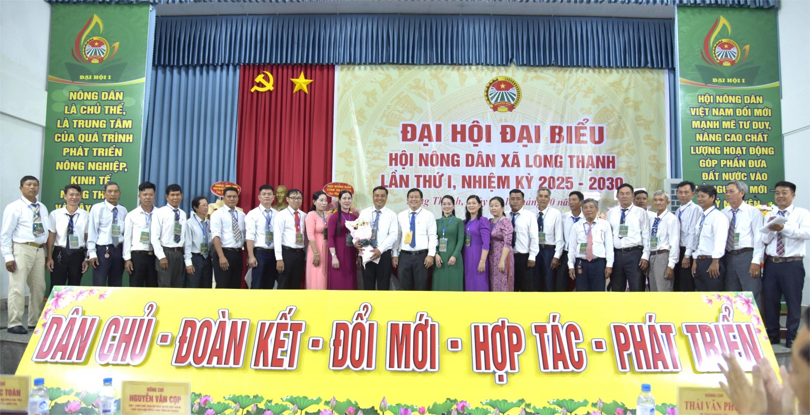 Phó Chủ tịch Ủy ban MTTQ Việt Nam tỉnh, Chủ tịch Hội Nông dân tỉnh Nguyễn Văn Cọp (thứ mười ba, từ trái qua) trao quyết định chỉ định và tặng hoa chúc mừng Ban Chấp hành Hội Nông dân xã Long Thạnh khóa I.