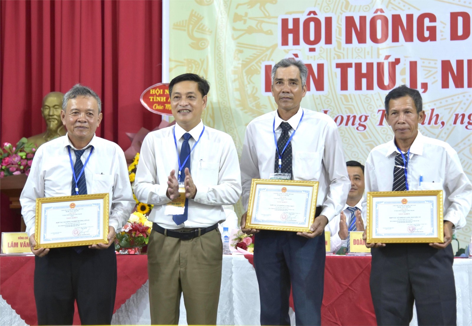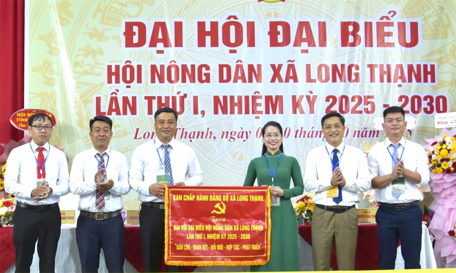 Bí thư Đảng ủy xã Long Thạnh Thái Văn Phúc (thứ hai, từ phải qua) tặng bức trướng cho đại hội.