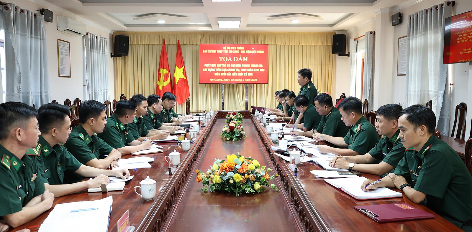 Thiếu tướng, Tiến sĩ Giang Văn Cử, Giám đốc Học viện Biên phòng, Trưởng đoàn khảo sát; Đại tá Phạm Văn Thắng, Phó Chỉ huy trưởng Bộ Chỉ huy Quân sự tỉnh, Chỉ huy trưởng Ban Chỉ huy Bộ đội Biên phòng tỉnh An Giang đồng chủ trì tọa đàm.
