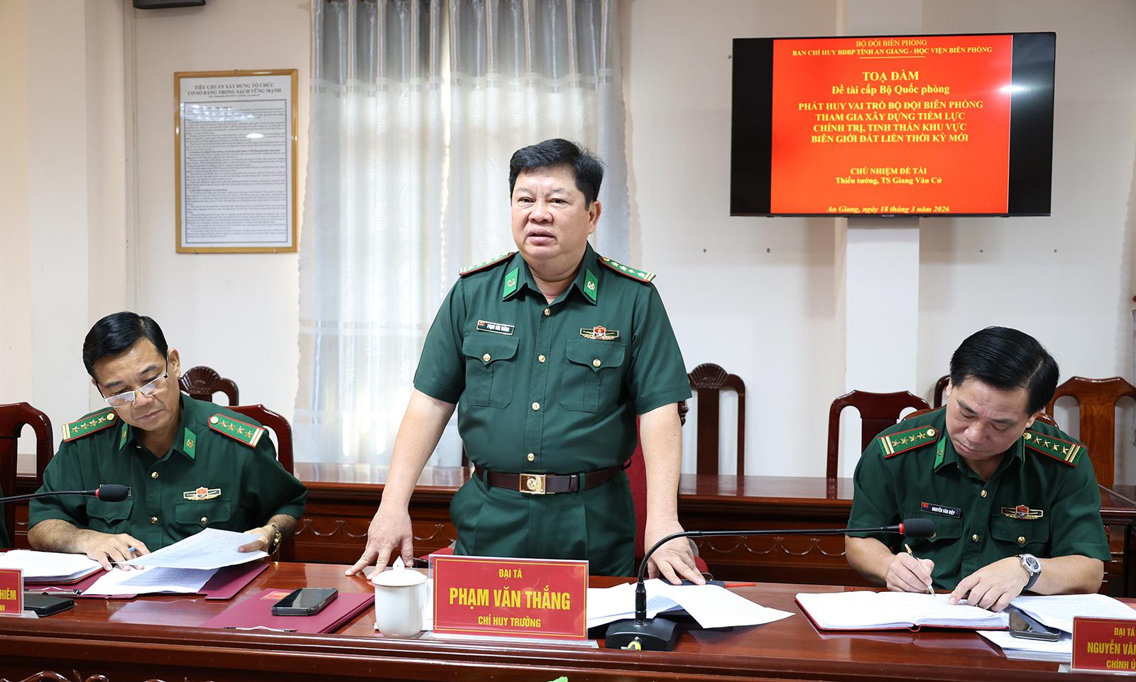 Đại tá Phạm Văn Thắng, Phó Chỉ huy trưởng Bộ Chỉ huy Quân sự tỉnh, Chỉ huy trưởng Ban Chỉ huy Bộ đội Biên phòng tỉnh An Giang trao đổi tại tọa đàm.