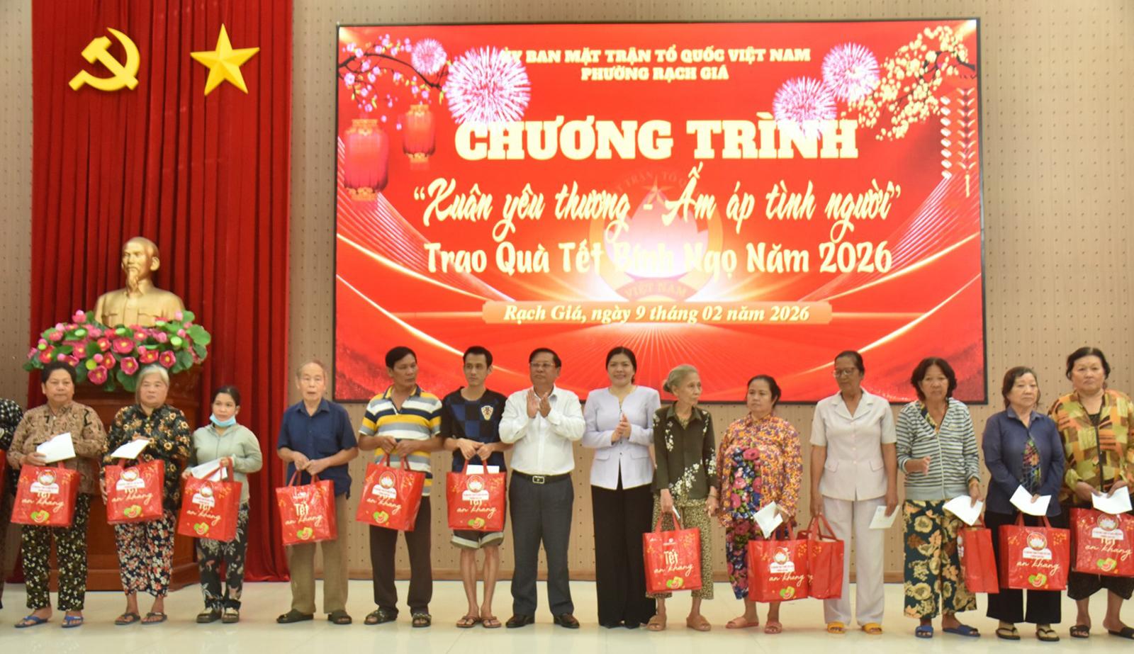 - Sáng 9/2, Ủy ban MTTQ Việt Nam phường Rạch Giá (tỉnh An Giang) tổ chức chương trình “Xuân yêu thương - Ấm áp tình người” trao quà Tết Bính Ngọ năm 2026 cho hộ nghèo, cận nghèo, hộ có hoàn cảnh khó khăn trên địa bàn.
