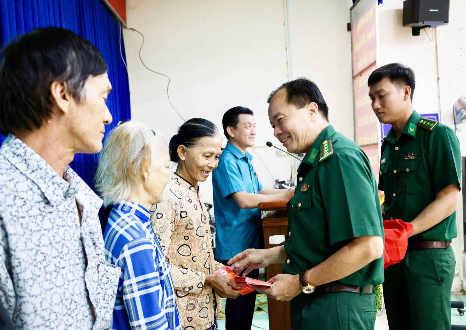 Đại tá Lê Hoàng Việt, Phó Chính ủy Ban Chỉ huy Bộ đội Biên phòng tỉnh An Giang trao quà của của Thiếu tướng Hoàng Hữu Chiến cho các hộ dân có hoàn cảnh khó khăn tại xã Long Kiến.