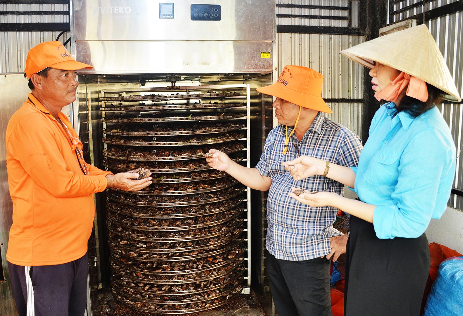 Anh Nguyễn Thanh Tuấn (bên trái) đầu tư lò sấy điện để sản xuất nhàu sấy khô. Ảnh: THÙY TRANG