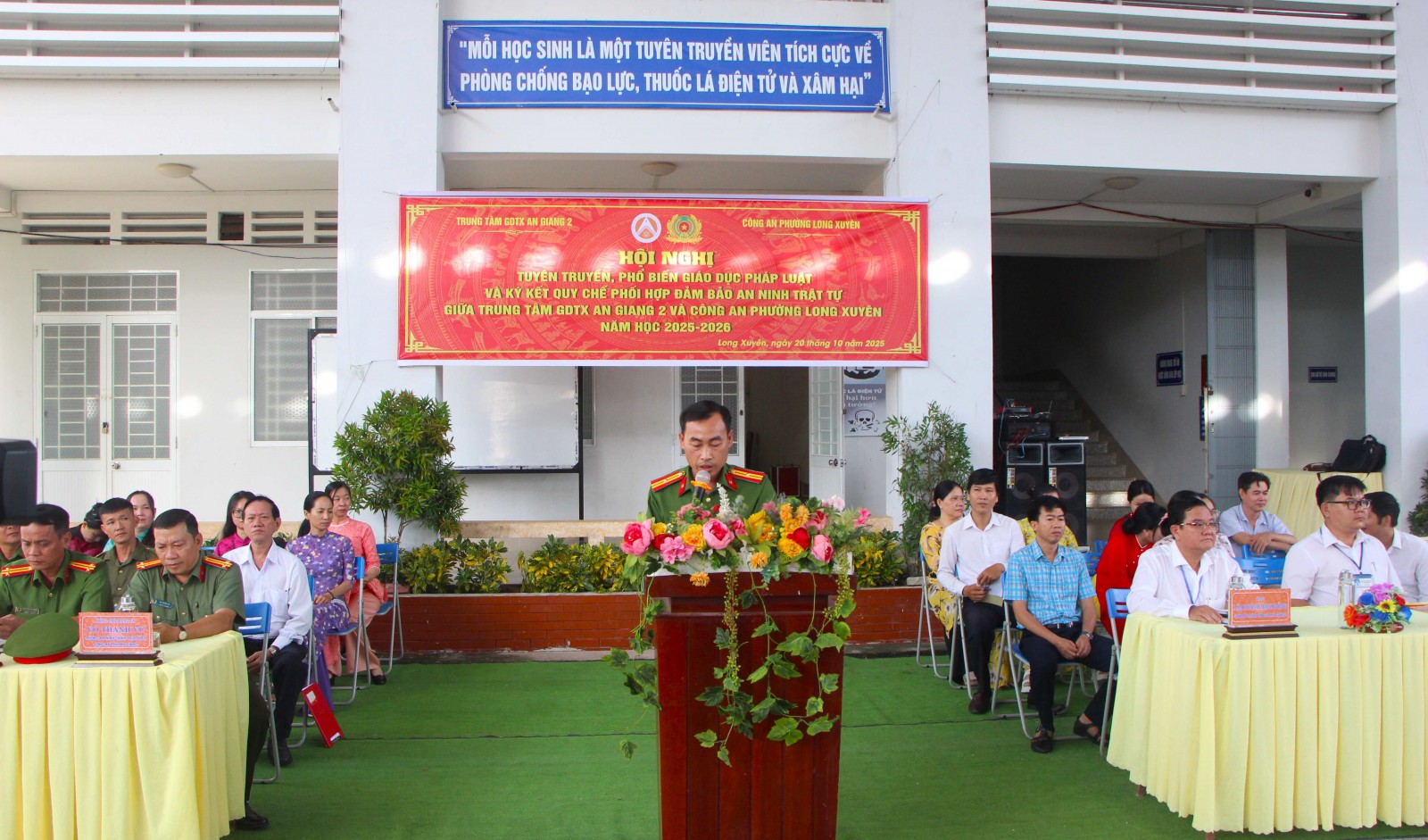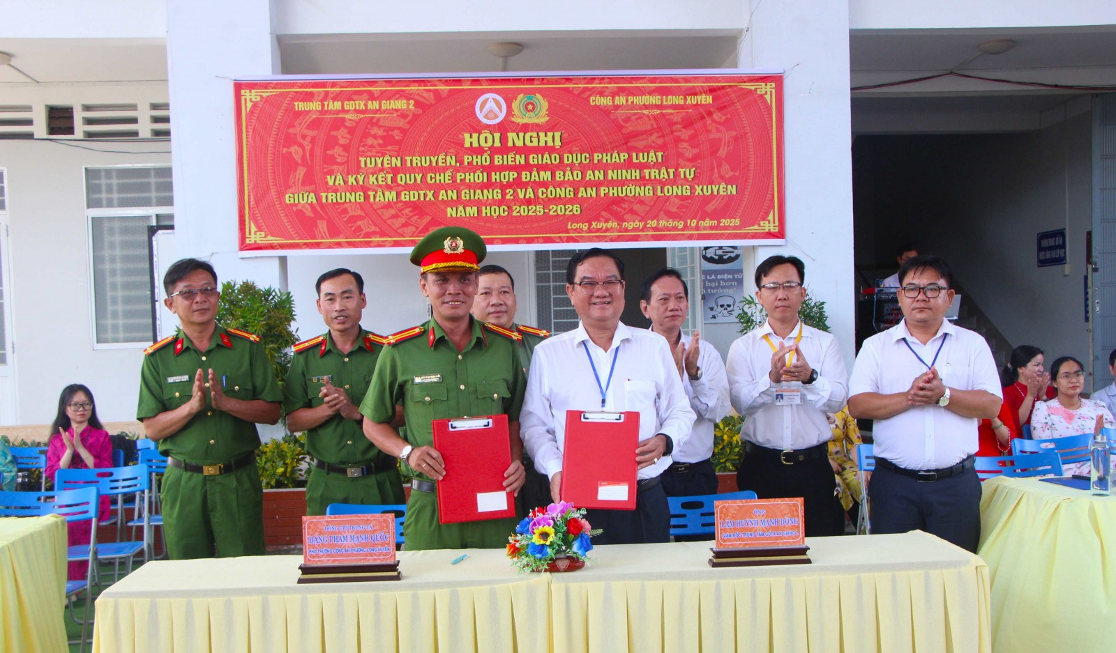 Sáng 20/10, Trung tâm Giáo dục Thường xuyên An Giang 2 phối hợp Công an phường Long Xuyên tổ chức Hội nghị tuyên truyền, phổ biến giáo dục pháp luật và ký kết quy chế phối hợp đảm bảo an ninh trật tự năm học 2025 - 2026.