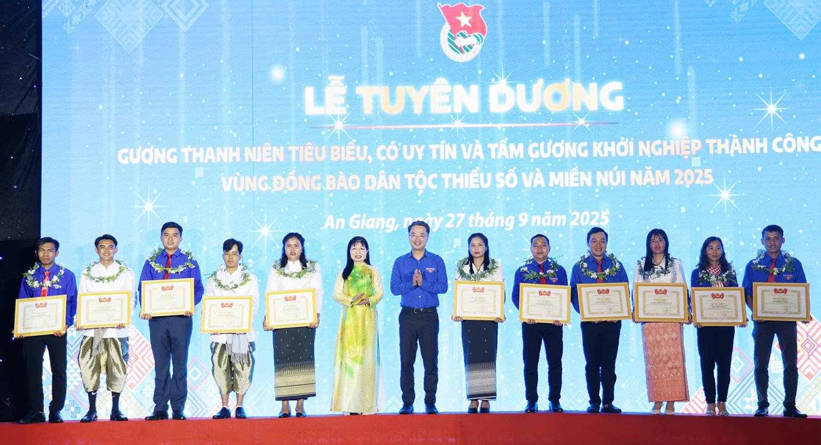 Tối 27/9, tại Quảng trường Thái Quốc Hùng, xã Tri Tôn (tỉnh An Giang), Trung ương Đoàn Thanh niên Cộng sản Hồ Chí Minh tổ chức lễ tuyên dương gương thanh niên tiêu biểu, có uy tín, tấm gương khởi nghiệp thành công ở vùng đồng bào dân tộc thiểu số miền núi năm 2025 - cụm Tây Nam Bộ.