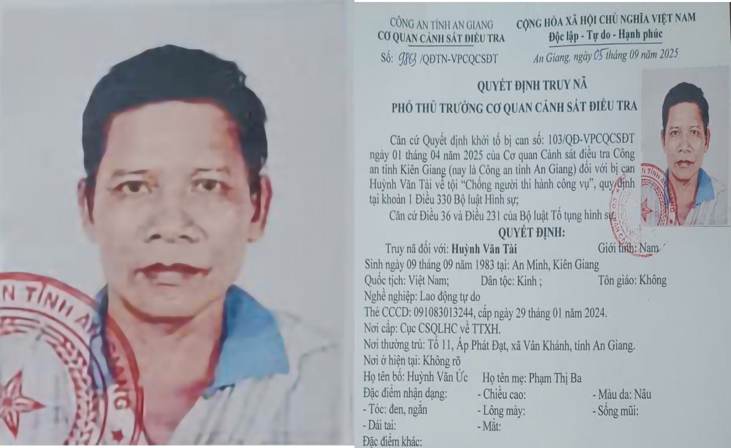 Chiều 12/9, Cơ quan Cảnh sát điều tra Công an tỉnh An Giang cho biết, đã ra quyết định truy nã đối với Huỳnh Văn Tài (sinh năm 1983, cư trú xã Vân Khánh, tỉnh An Giang) về tội chống người thi hành công vụ.