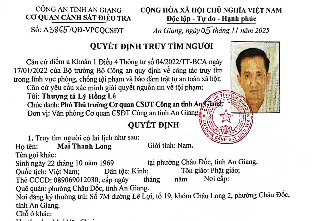 - Sáng 8/11, Cơ quan Cảnh sát điều tra Công an tỉnh An Giang cho biết, đã ra quyết định truy tìm đối tượng Mai Thanh Long (sinh năm 1969, cư trú số 7M đường Lê Lợi, phường Châu Đốc, tỉnh An Giang), để phục vụ công tác điều tra vụ án “Lừa đảo chiếm đoạt tài sản”.