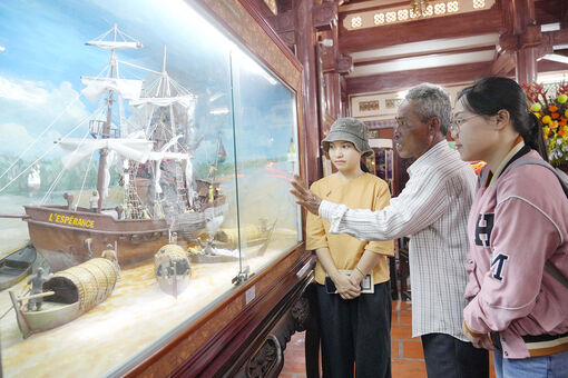 Người dân tham quan mô hình mô phỏng trận chiến nhấn chìm tiểu pháo hạm L’Espérance tại vàm Nhựt Tảo do Anh hùng dân tộc Nguyễn Trung Trực chỉ huy. Ảnh: TRUNG HIẾU