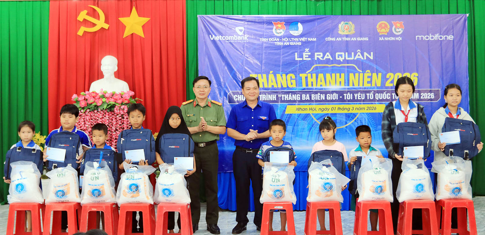 Trong chuỗi hoạt động tại xã Nhơn Hội, nhiều phần việc ý nghĩa được triển khai đồng bộ: Khám bệnh, cấp thuốc và tặng quà cho hơn 300 người dân có hoàn cảnh khó khăn; trao 10 suất học bổng (mỗi suất 1 triệu đồng) cho học sinh nghèo theo Đề án “Tuổi trẻ Công an nhân dân hỗ trợ thanh thiếu nhi có hoàn cảnh khó khăn tới trường giai đoạn 2023 - 2027”; xây dựng công trình “Thắp sáng đường biên” với hệ thống đèn năng lượng mặt trời trên 4 tuyến đường; tuyên truyền pháp luật về an toàn giao thông, phòng, chống ma túy; tặng quà cho 50 hộ dân và lực lượng an ninh, trật tự cơ sở, mỗi suất trị giá 500.000 đồng.