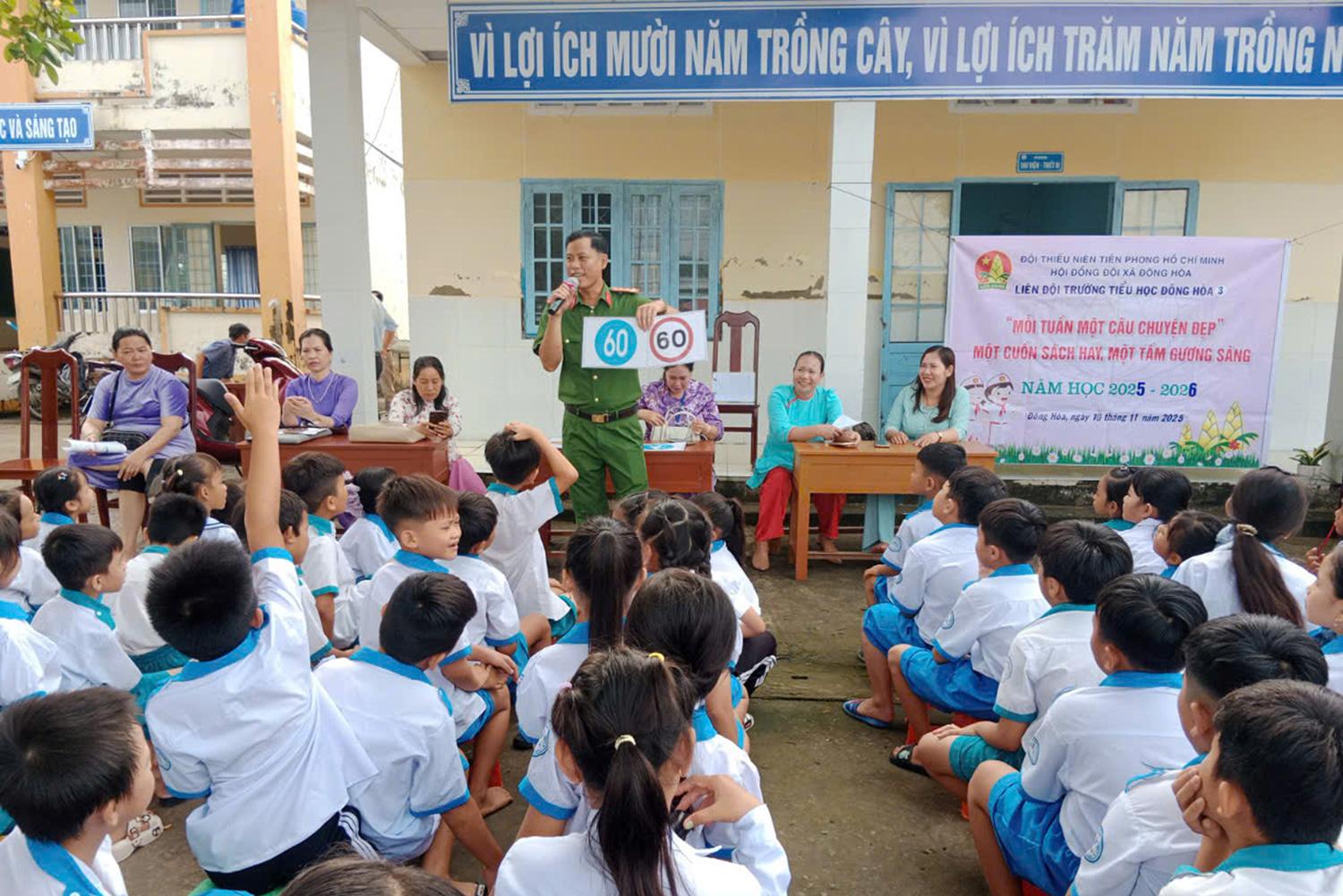 Công an xã Đông Hòa tuyên truyền pháp luật về an toàn giao thông tại Trường Tiểu học Đông Hòa 3. Ảnh: ÚT CHUYỀN