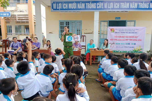 Tại Trường Tiểu học Đông Hòa 3, buổi tuyên truyền thu hút gần 600 học sinh tham gia. Từ sáng sớm, lực lượng công an phối hợp giáo viên chuẩn bị bảng, biển báo minh họa, tình huống mô phỏng để học sinh dễ dàng hình dung. Buổi sinh hoạt mở đầu bằng những câu hỏi vui về biển báo quen thuộc trên đường như đường một chiều, trường học, đường dành cho xe đạp… Nhiều học sinh tỏ ra thích thú khi được thử sức đoán ý nghĩa từng loại biển báo, tạo không khí hào hứng.