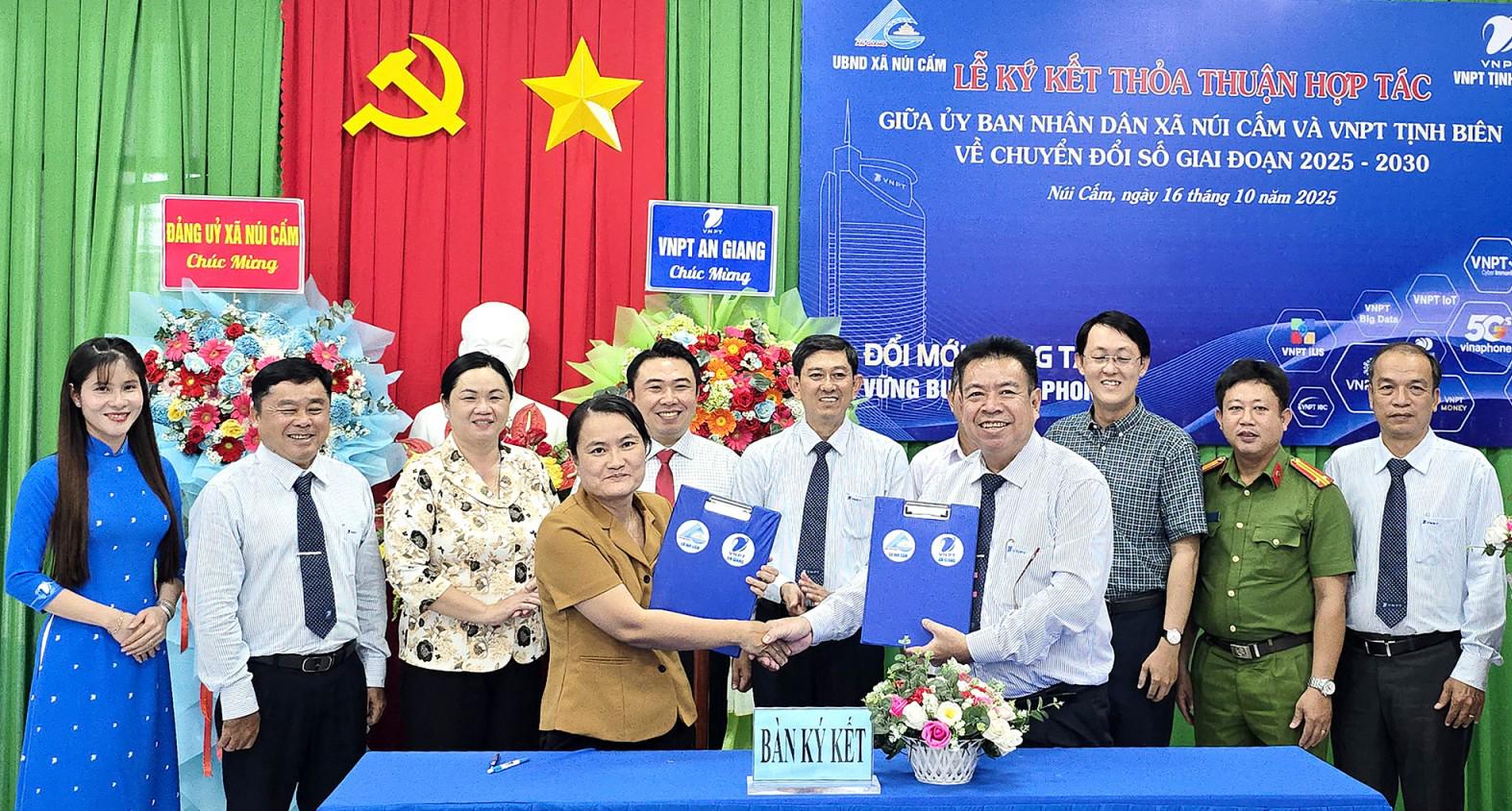 - Chiều 16/10, UBND xã Núi Cấm (tỉnh An Giang) và VNPT Tịnh Biên tổ chức lễ ký thỏa thuận hợp tác chuyển đổi số giai đoạn 2025 - 2030.