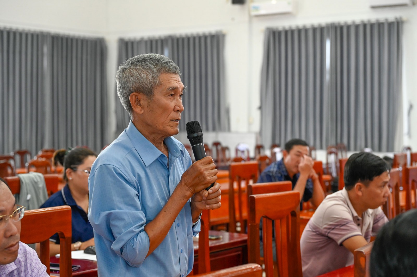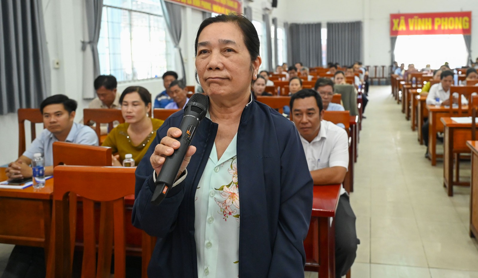 Cử tri Thái Hồng Nhung, ấp Vĩnh Đông 2, phát biểu ý kiến tại buổi tiếp xúc.