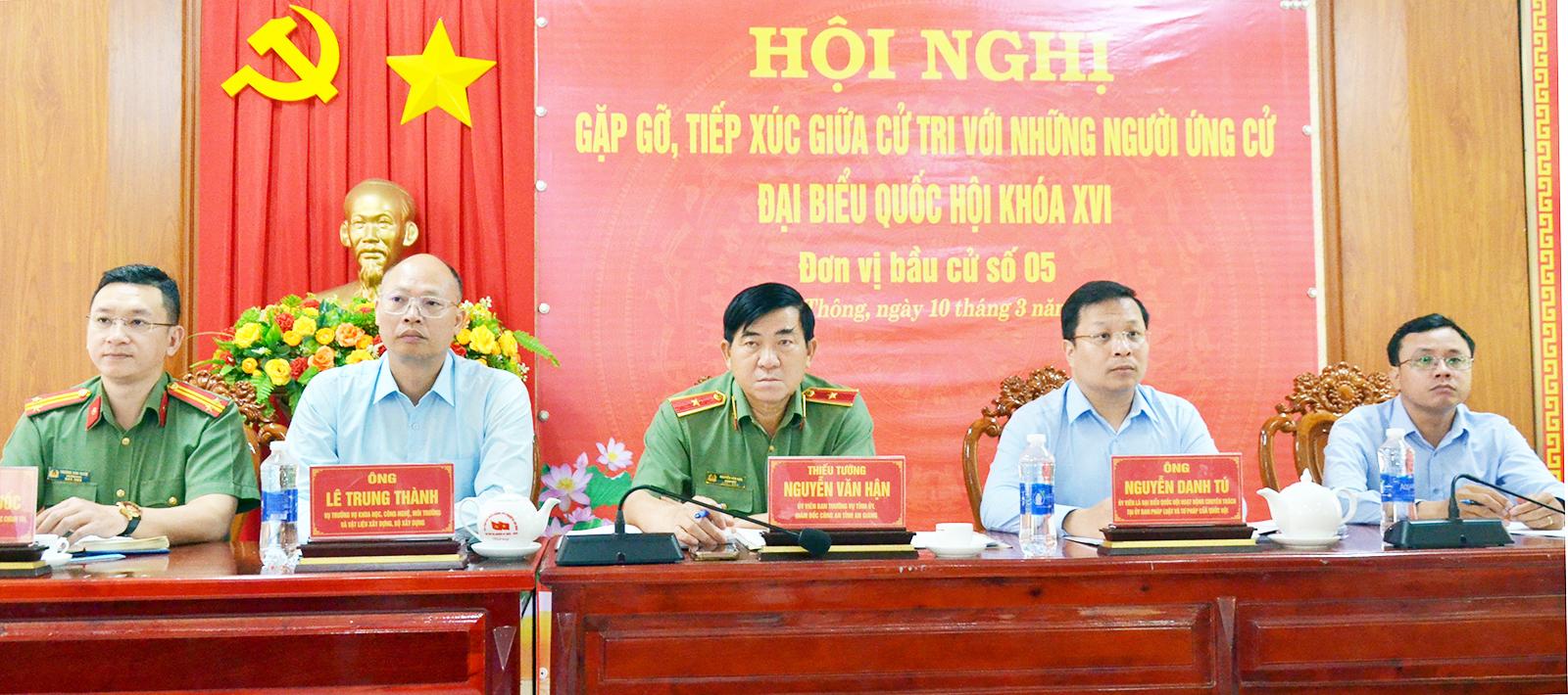 Các ứng cử viên đại biểu Quốc hội khóa XVI đơn vị bầu cử số 5, gồm: Ông Trần Thế Định, Phó trưởng Khoa Sư phạm phụ trách, Trường Đại học An Giang; ông Nguyễn Văn Hận, Ủy viên Ban Thường vụ Tỉnh ủy, Bí thư Đảng ủy, Giám đốc Công an tỉnh An Giang; ông Trương Văn Quốc, Bí thư Chi bộ, Trưởng ban Thanh niên Công an tỉnh An Giang; ông Lê Trung Thành, Ủy viên Ban Chấp hành Đảng bộ Bộ Xây dựng, Bí thư Chi bộ, Vụ trưởng Vụ Khoa học, công nghệ, môi trường và Vật liệu xây dựng (Bộ Xây dựng), Phó Chủ tịch Hội Vật liệu xây dựng Việt Nam; ông Nguyễn Danh Tú, Ủy viên Ủy ban Kiểm tra Đảng ủy, Ủy viên là đại biểu Quốc hội hoạt động chuyên trách tại Ủy ban Pháp luật và Tư pháp của Quốc hội, Phó Chủ tịch Nhóm Nghị sĩ hữu nghị Việt Nam - Mexico, Phó Chủ tịch Nhóm Đại biểu Quốc hội trẻ.
