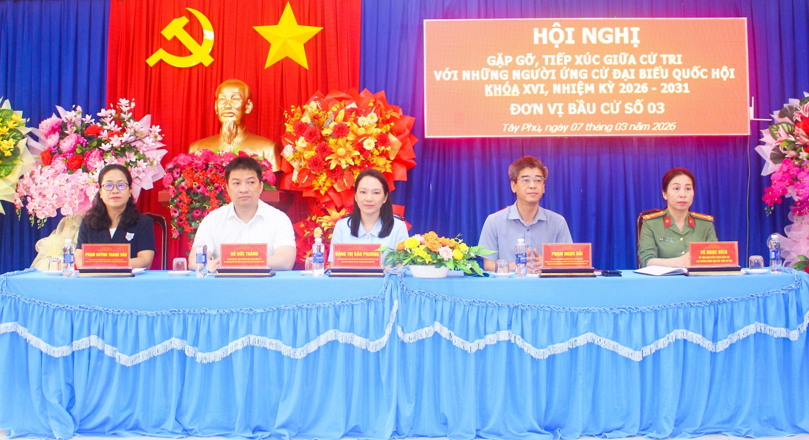 Các ứng cử viên đại biểu Quốc hội khóa XVI đơn vị bầu cử số 3, gồm: Bà Võ Ngọc Bích, Ủy viên Ban Chấp hành Đảng bộ, Phó trưởng Phòng Hậu cần Công an tỉnh An Giang; ông Phạm Ngọc Hải, Vụ trưởng Vụ Quốc phòng, An ninh và Đối ngoại thuộc Ủy ban Quốc phòng, An ninh và Đối ngoại của Quốc hội; bà Đặng Thị Bảo Phương, Phó Bí thư Chi bộ, Phó Chủ tịch Ủy ban MTTQ Việt Nam kiêm Chủ tịch Hội Liên hiệp Phụ nữ phường Châu Đốc (tỉnh An Giang); ông Hồ Đức Thắng, Bí thư Chi bộ, Viện trưởng Viện Công nghệ số và Chuyển đổi số quốc gia (Bộ Khoa học và Công nghệ); bà Phạm Huỳnh Thanh Vân, Ủy viên Chi bộ 8, Phó trưởng Khoa Nông nghiệp - Tài nguyên thiên nhiên, Trưởng bộ môn Phát triển nông thôn - Nông nghiệp bền vững, Trường Đại học An Giang.