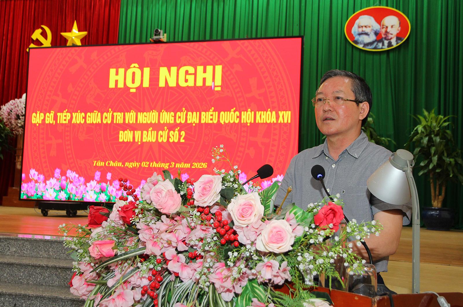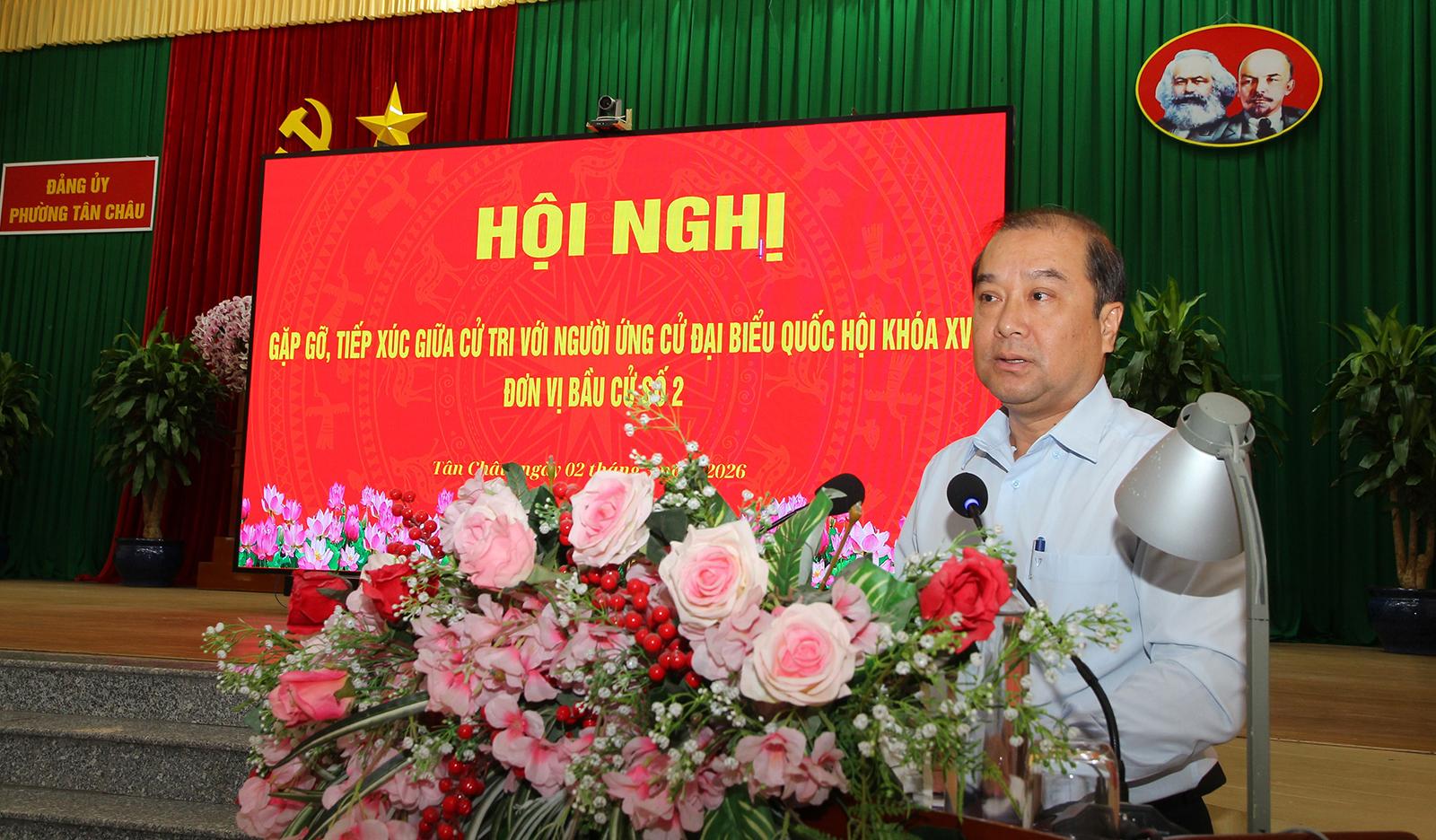 Sáng 2/3, Ban Thường trực Ủy ban MTTQ Việt Nam phường Tân Châu tổ chức Hội nghị tiếp xúc cử tri với những người ứng cử đại biểu Quốc hội khóa XVI, đơn vị bầu cử số 2, tỉnh An Giang. Dự hội nghị có Phó Chủ tịch Ủy ban MTTQ Việt Nam tỉnh An Giang Lê Hoàng Vũ; lãnh đạo các sở, ban, ngành và đông đảo cử tri địa phương.