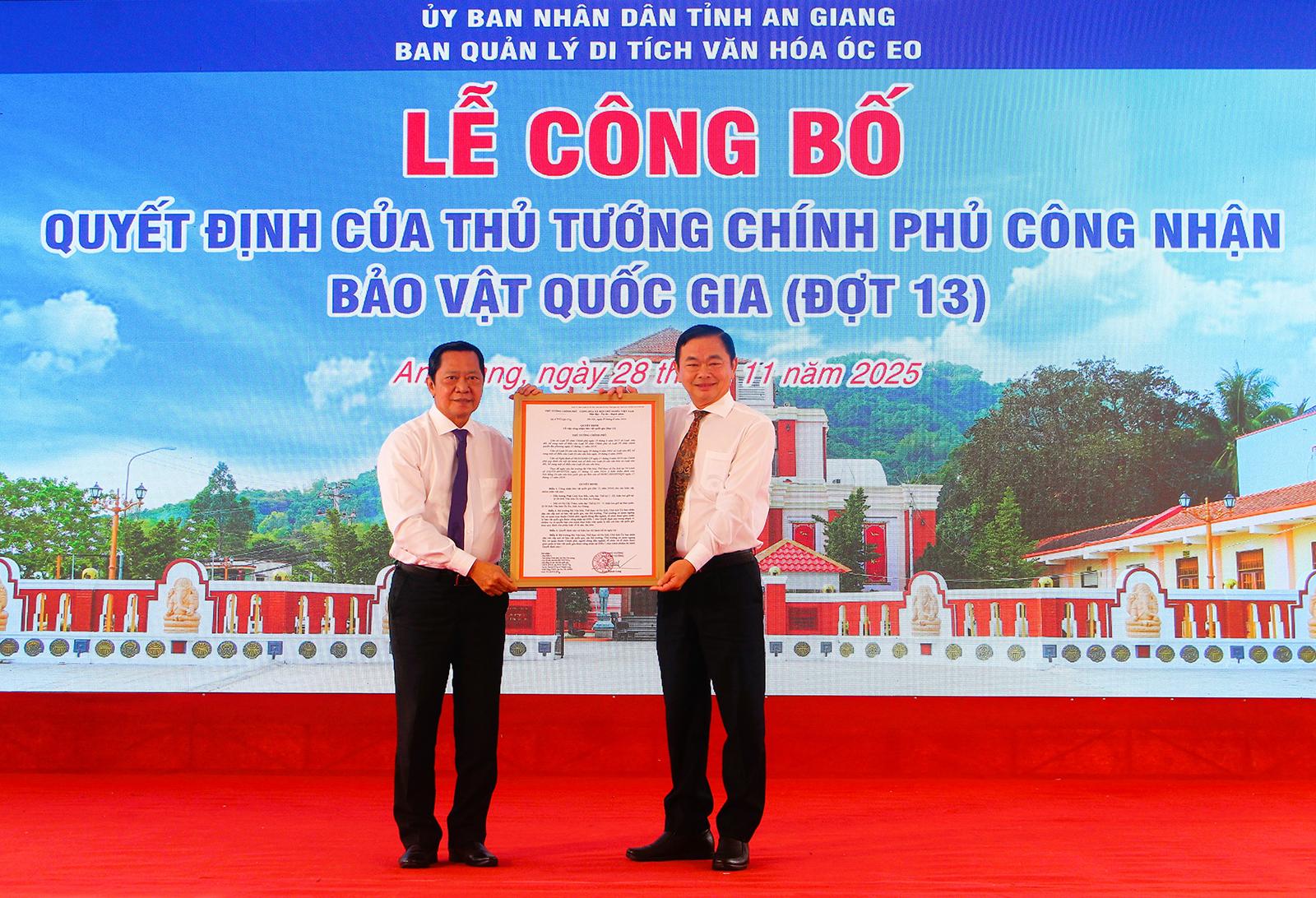 Giám đốc Ban Quản lý di tích văn hóa Óc Eo Nguyễn Văn Nhiên (bên phải) nhận quyết định của Thủ tướng Chính phủ công nhận 2 bảo vật quốc gia. Ảnh: PHƯƠNG LAN