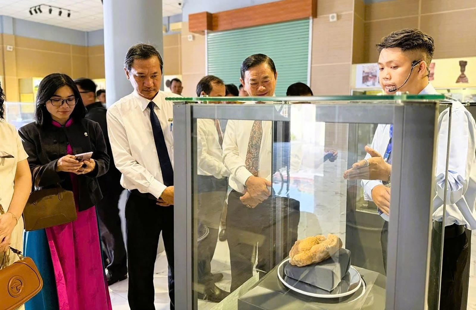 Khách tham quan, tìm hiểu bảo vật quốc gia đầu tượng Phật Linh Sơn Bắc và Mộ vò Gò Cây Trâm. Ảnh: PHƯƠNG LAN
